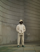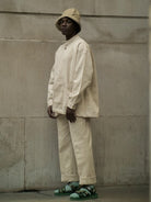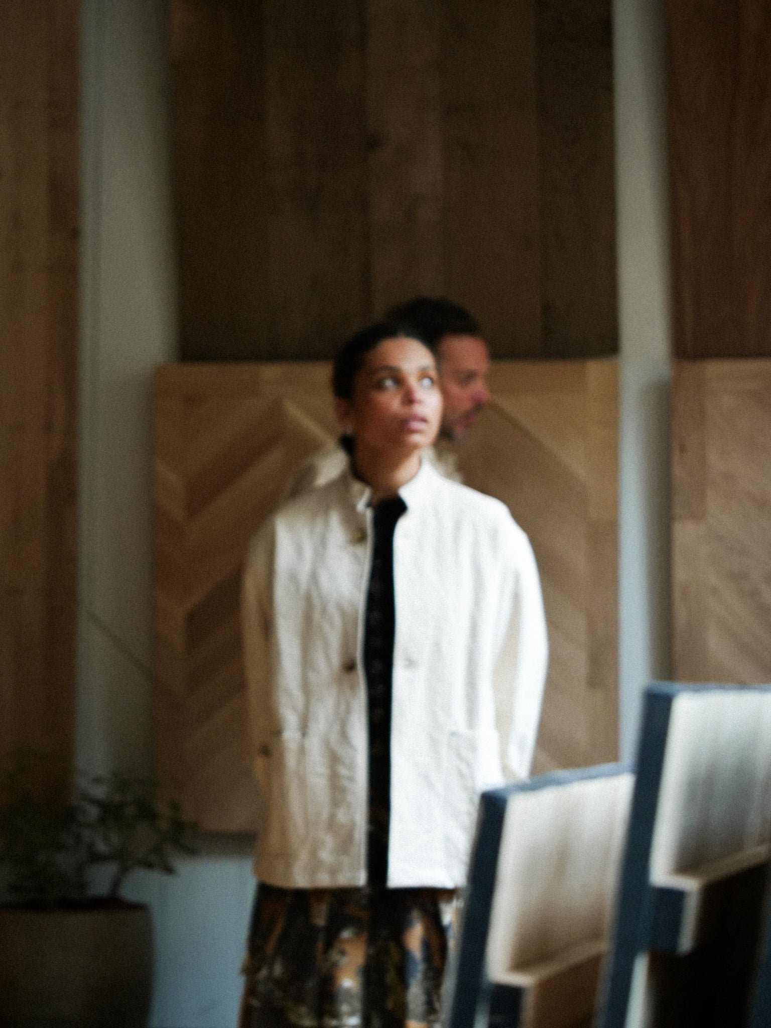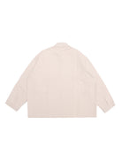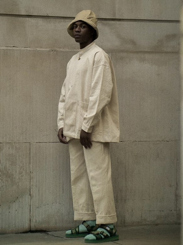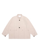 Two-buttoned, mandarin collared over-sized jacket with a straight fit and two squared front pockets.