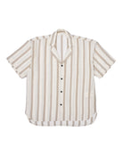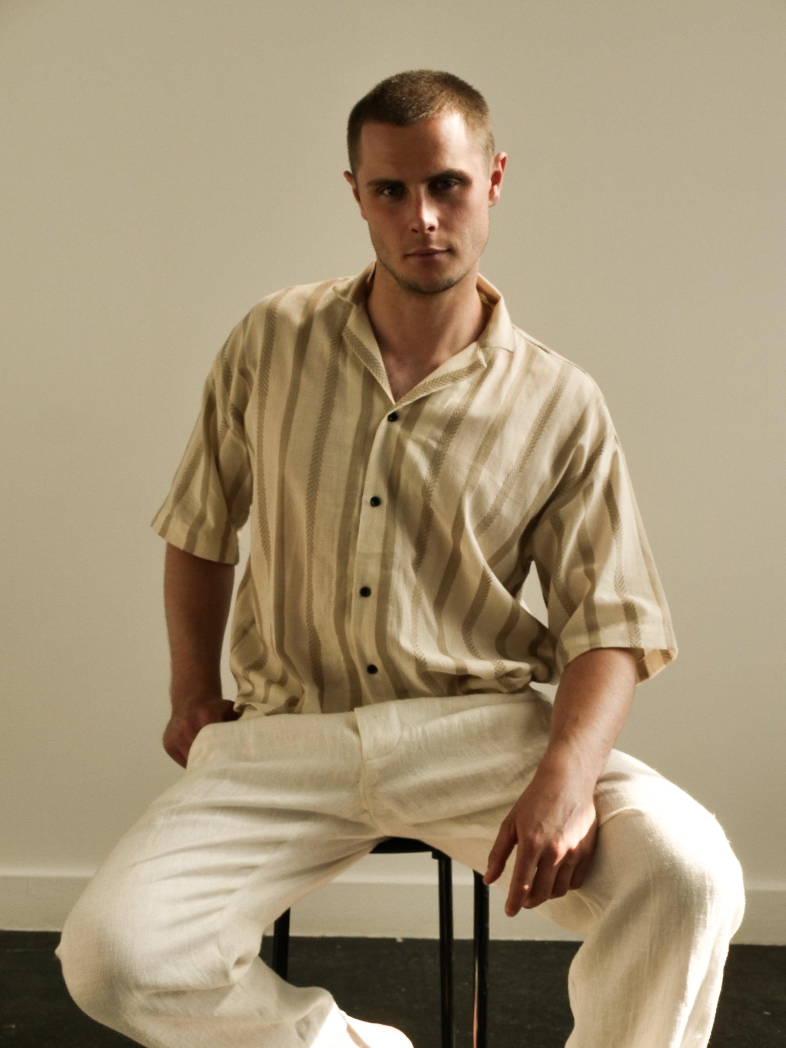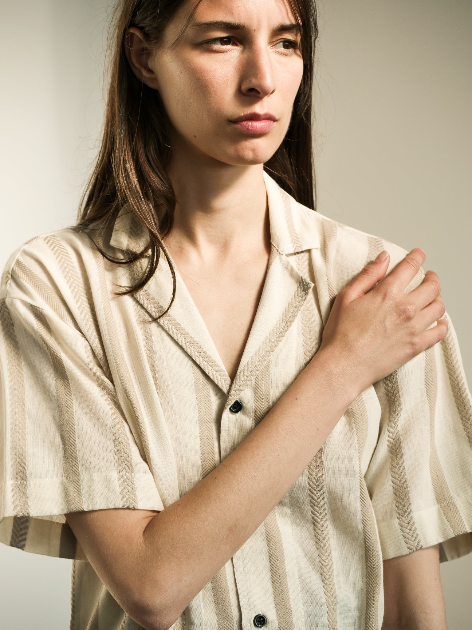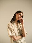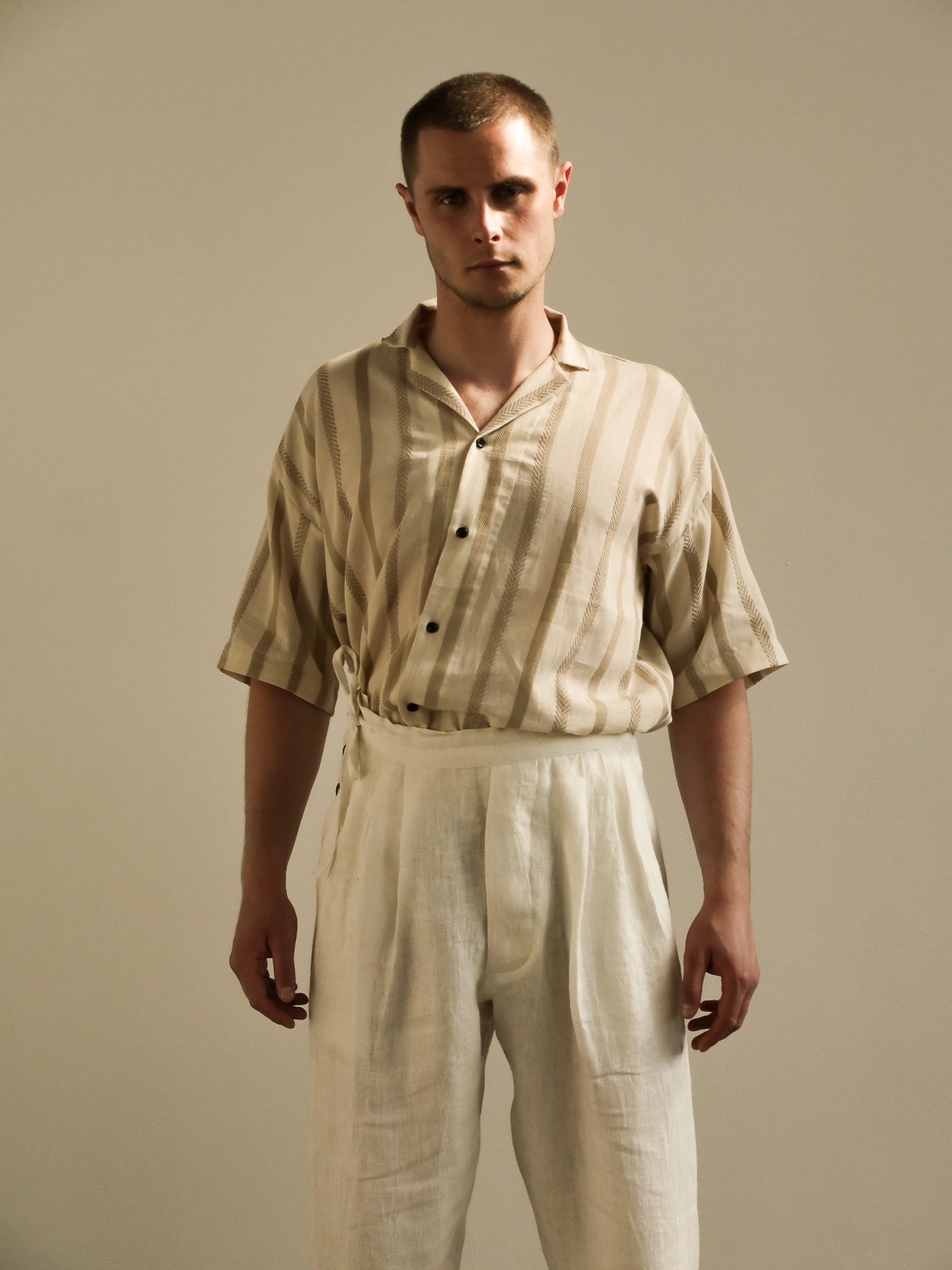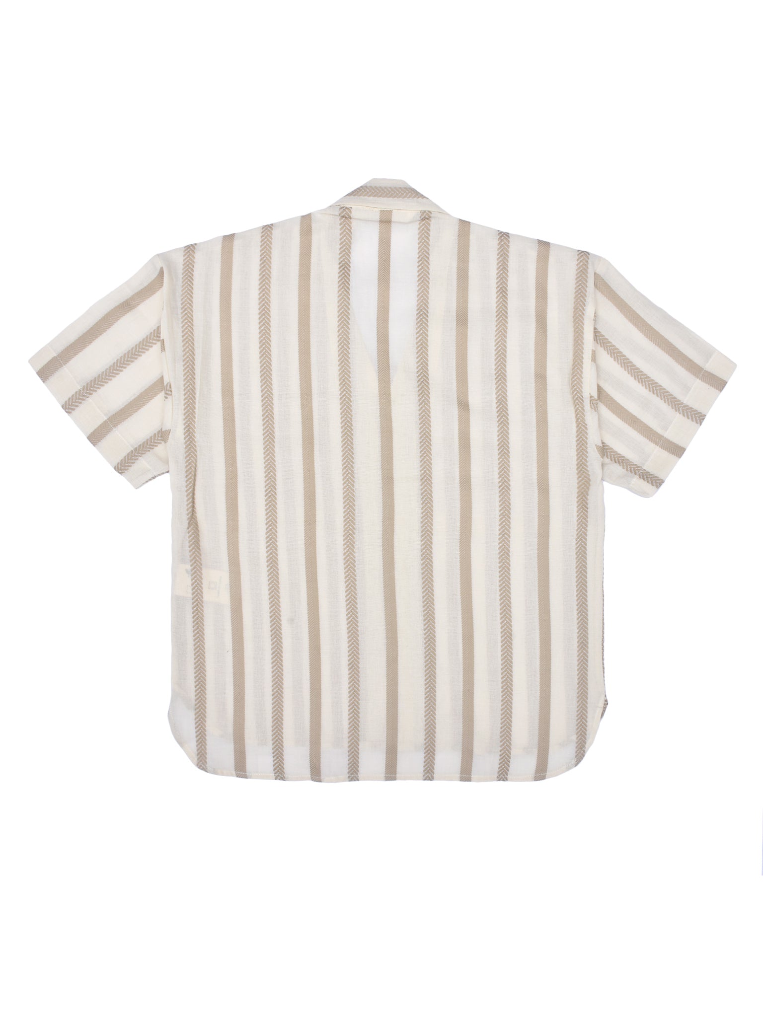 Generous half-sleeved shirt in pure cotton fabrics with four buttoned front, seamless lapel neck and collar, and circular side ends.