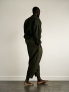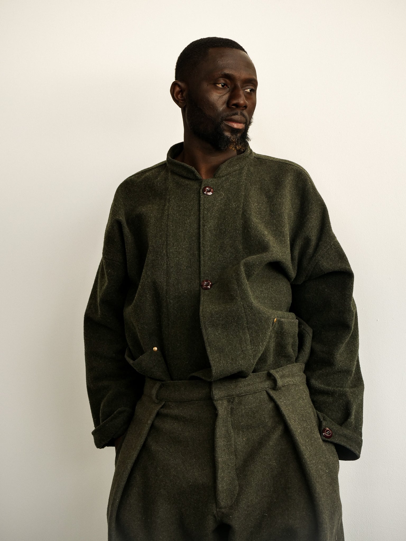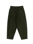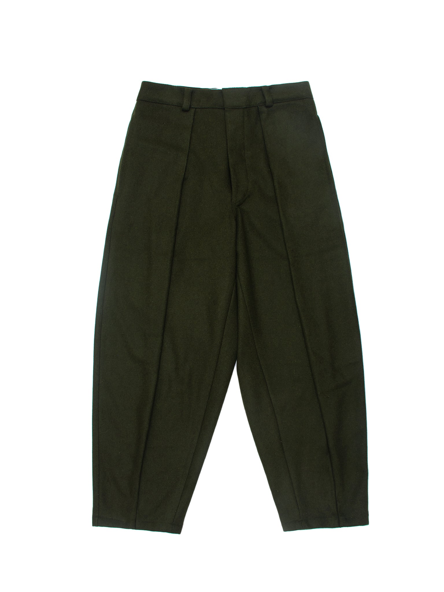 Inward deep pleated trousers with a tapered lower front and bag top. Ankle lengthed. Made in dark olive wool melton, lined till mid-thigh