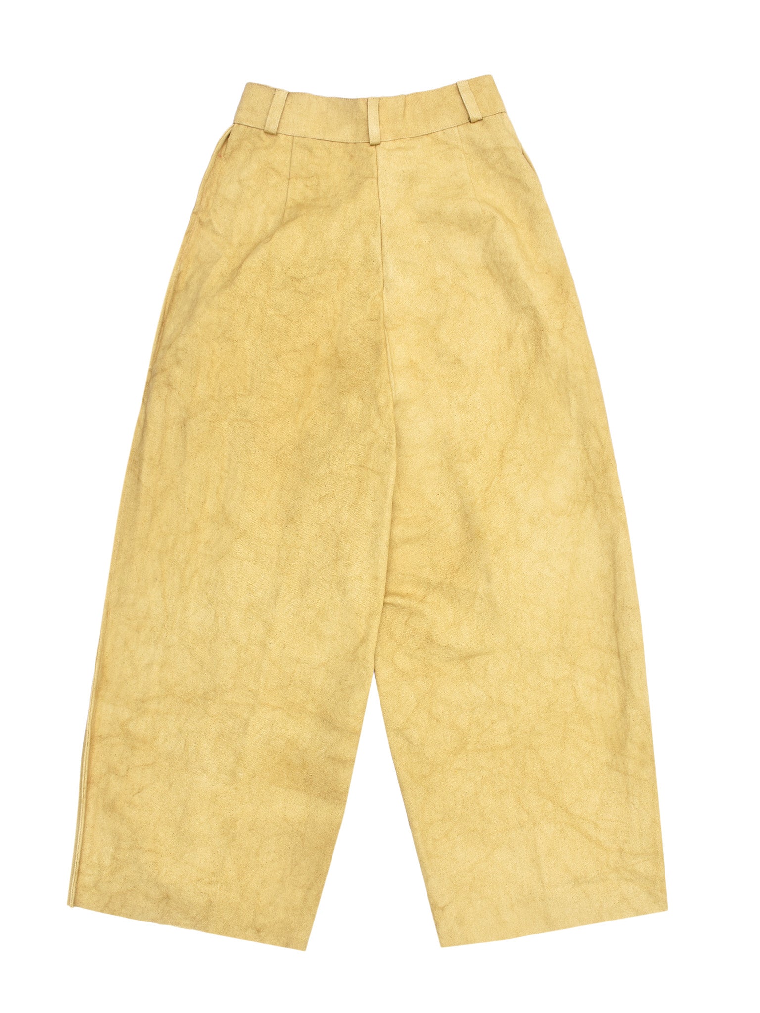 Wide legged, inward pleated trousers with frayed leg opening. Protruded tube seam. Naturally dyed canvas with abstract and subtle fade