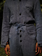 Made in a beautifully soft cotton fabric weaved in a jute like texture and finish, the Laziness Reforms trousers epitomise the paisan spirit. Edges of the trousers have been left unhemmed securely, the threads sometimes fraying to depict the coarseness of the land and days on it.